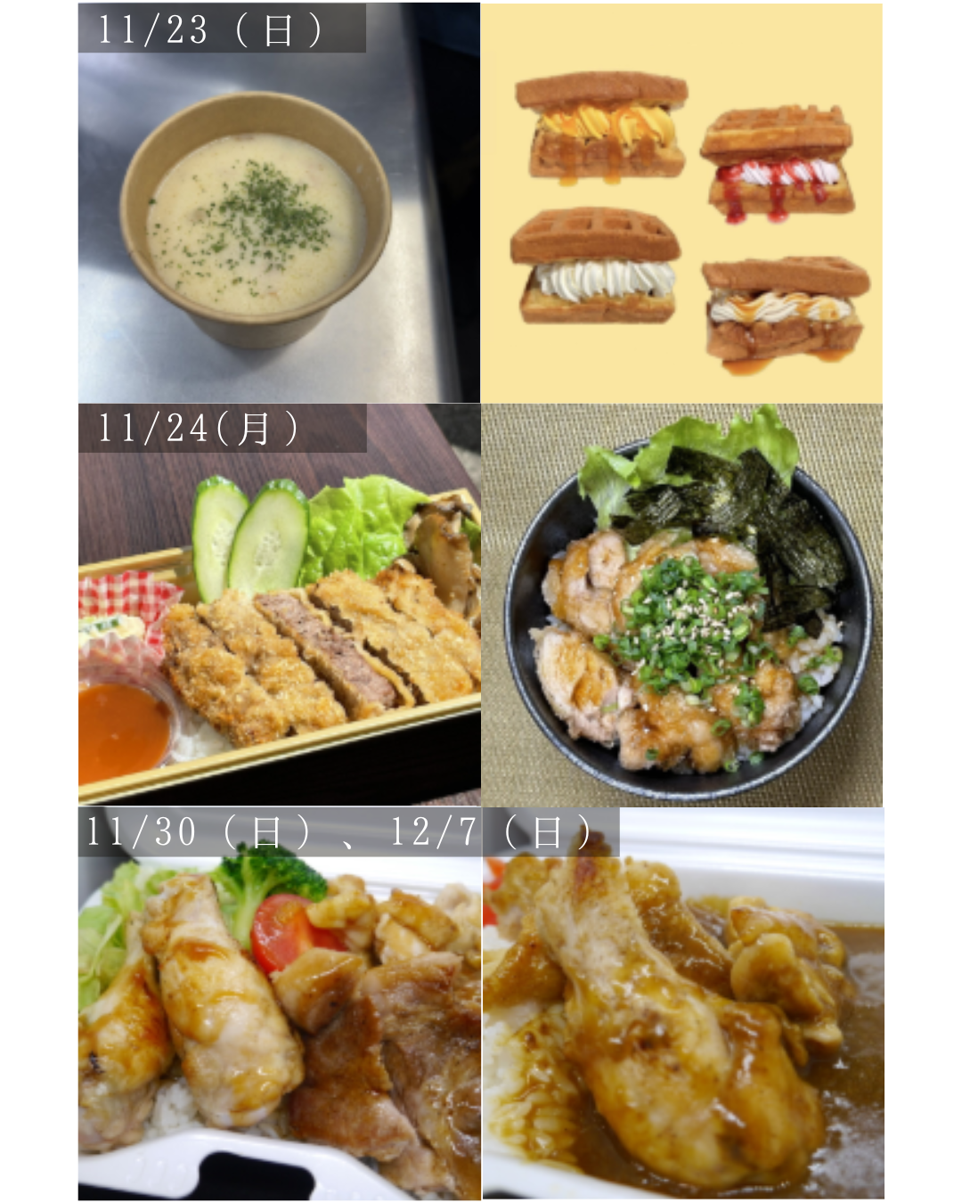 メニュー:日替わりスープ、ワッフルサンド等