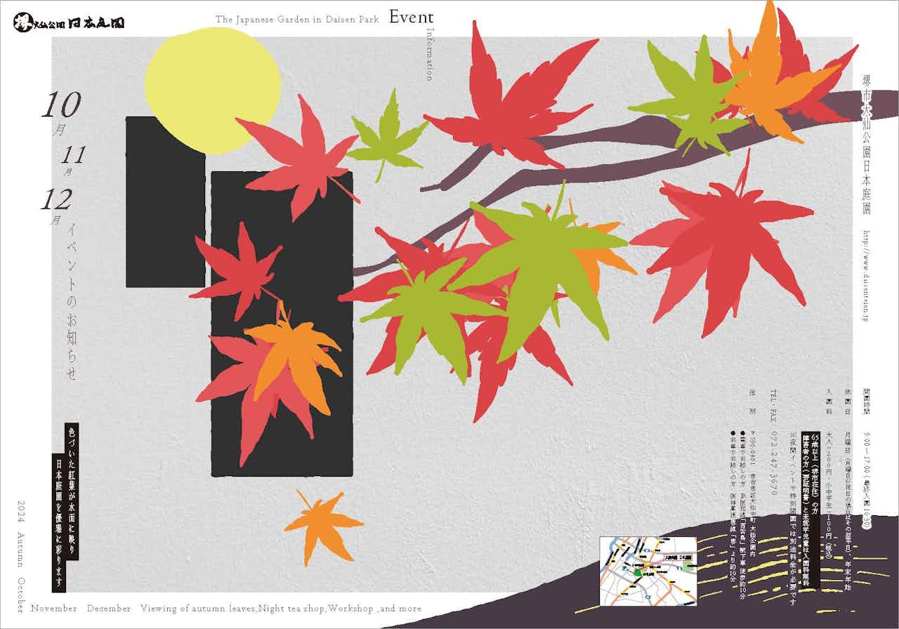 2024.09/13イベントリーフレット(10~12月)発行のお知らせこの度イベントリーフレット(10~12月)が完成致しました。大仙公園日本庭園にて配布中です。夜間特別開園時の紅葉のイラストが目印となっております。ぜひ一度手に取ってご覧ください。ホームお知らせイベントリーフレット(10~12月)発行のお知らせ