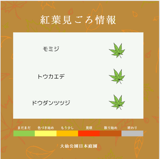 2025.10/17紅葉見ごろ情報のお知らせ大仙公園日本庭園の紅葉情報についてお知らせいたします。※本ページは週に1回の頻度で更新致します。※最終更新日:2025年10月17日 こちらはあくまで目安となりますので、ご了承ください。なお現地の様子は、大仙公園日本庭園SNSよりご参照ください。InstagramアカウントXアカウントホームお知らせ紅葉見ごろ情報のお知らせ